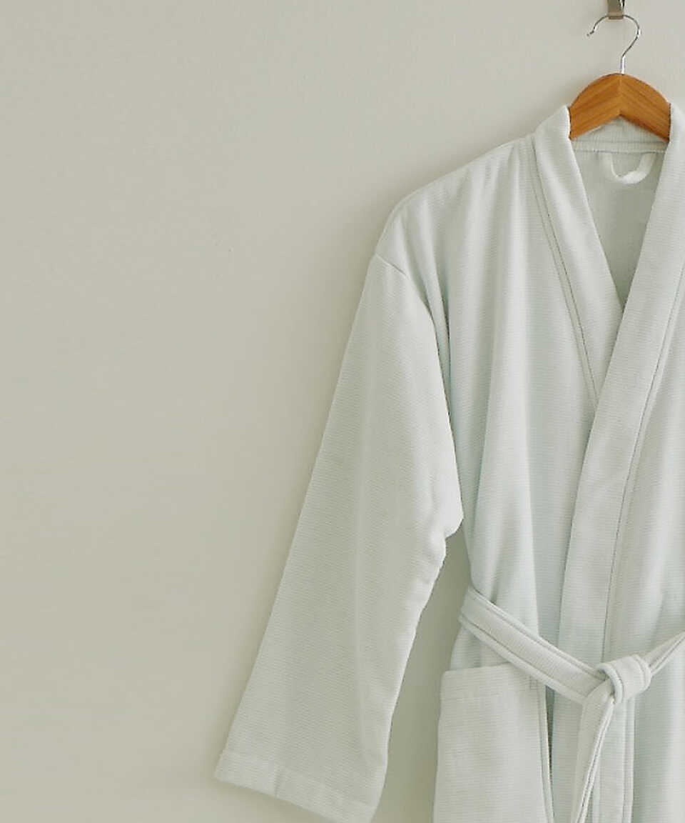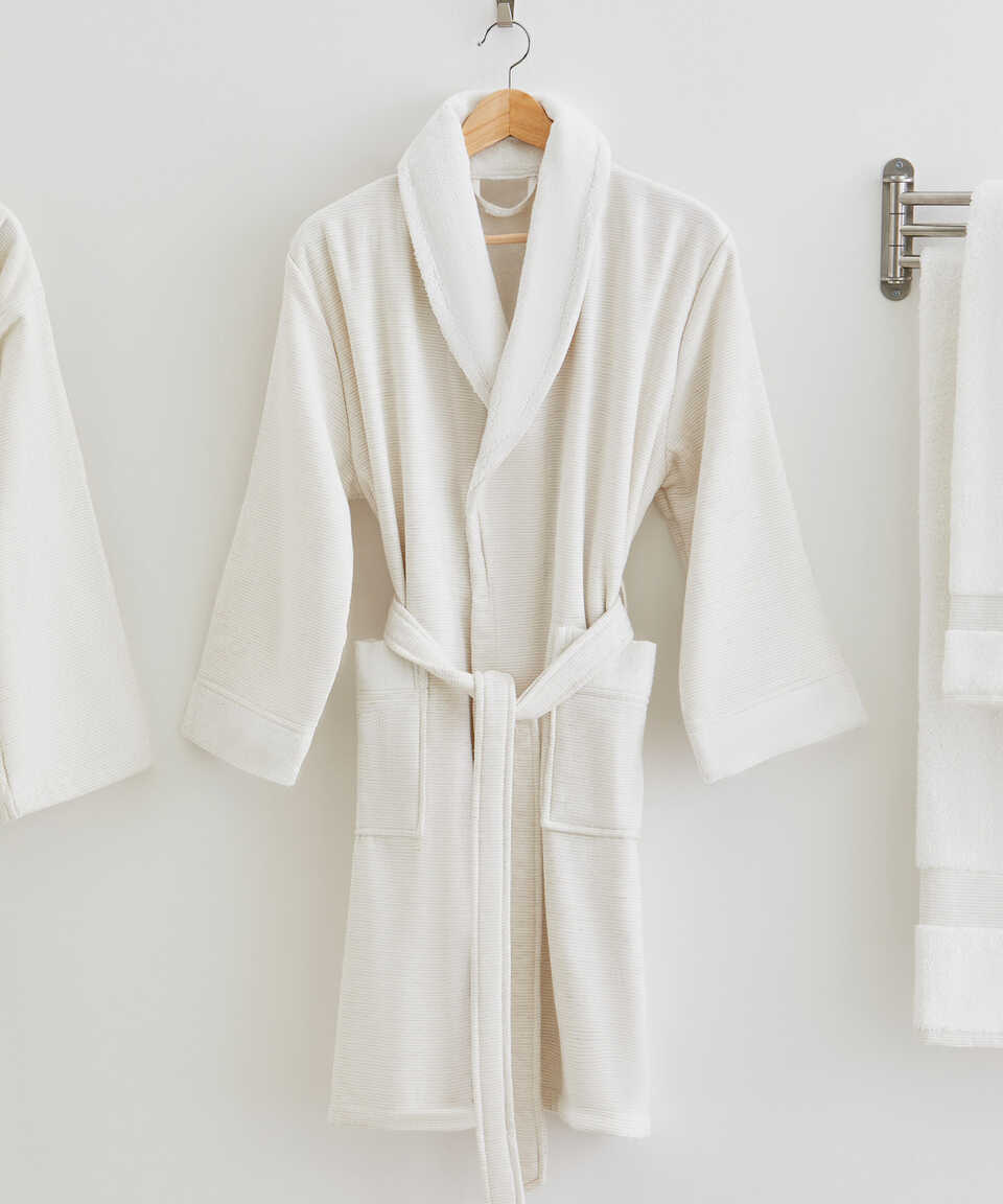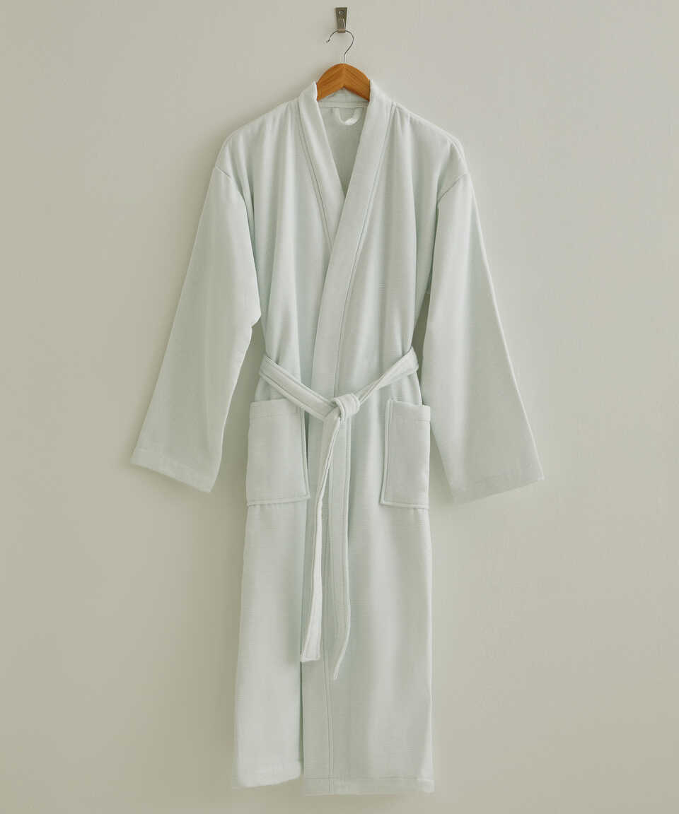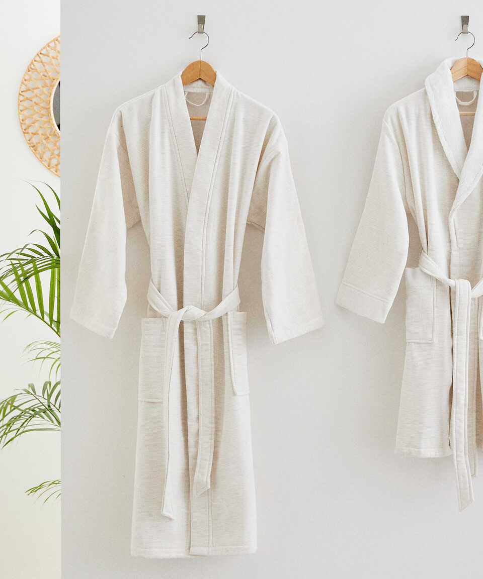 The inner surface is bouclé and the outer surface is fabric. Thanks to the Micro Touch yarn quality used on its inner surface, it does not lose its softness after washing. Due to its cotton structure, it has high water absorbency. It is a product where you can find comfort thanks to the cotton inner surface, and elegance thanks to the cotton/linen blend and minimal lines on its outer surface. You can combine your bathrobe with Kilyos Hamam or Kilyos Lale 50x100 cm towels in the towel category. The inner surface is terry, the outer surface is fabric. Thanks to the Micro Touch yarn quality used on its inner surface, it does not lose its softness after washing. Because of its cotton content, water absorbency is high. It is a product where you can find comfort thanks to the cotton on the inner surface, and elegance thanks to the cotton/linen mixture and minimal lines on the outer surface. You can combine your bathrobe with Kilyos Hamam or Kilyos Lale 50x100 cm towels, which are in the towel category. Product Content / Content; 97 % Cotton - 3 % Linen Weight; 400 g/m² Size Options / Sizes & Model; S / M Shawl Collar Bathrobe, L / XL Kimono Bathrobe Color Options / Colors; Mint / Water Green, Blue, Pink / Pink / Beige / Beige Bathrobe Measurements / Measurements in cm; (Unit of measurement: cm) Chest Widht: S / M: 58 cm , L / XL: 62 cm Overall Length: S / M: 100 cm , L / XL: 125 cm