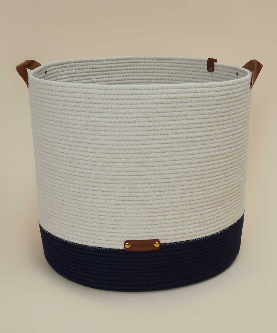 LEATHER HANDLED BASKET 40X36 cm NAVY BLUE-CREAM