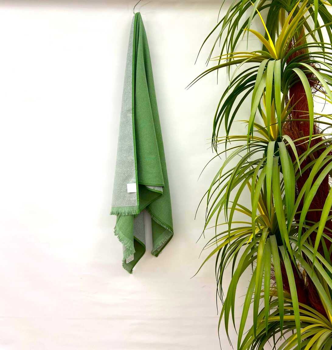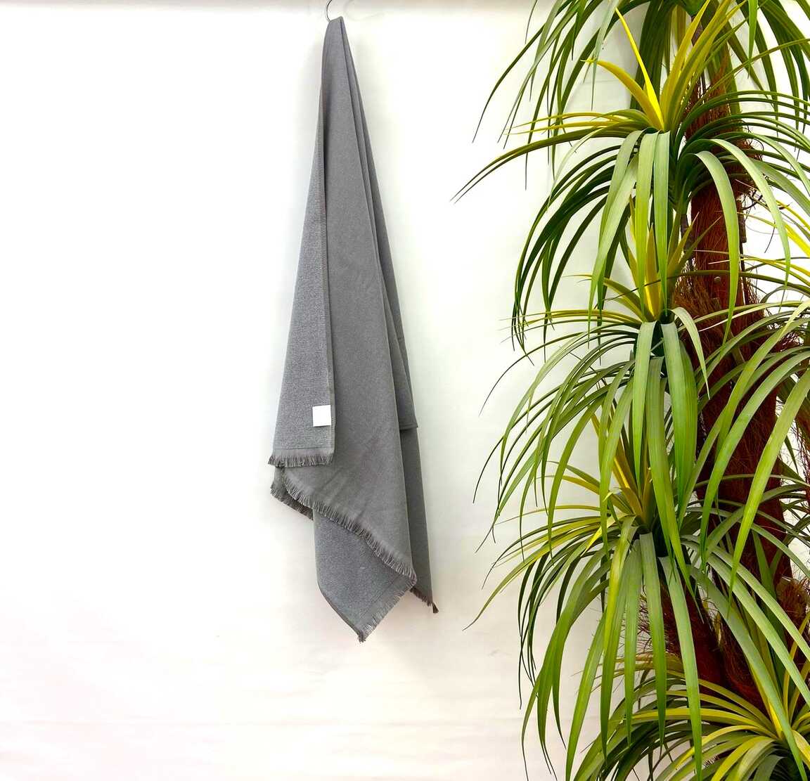 100% cotton. The front side of the product is loincloth and the back side is boucle. It is 75X150 cm in size and 320 GSM.