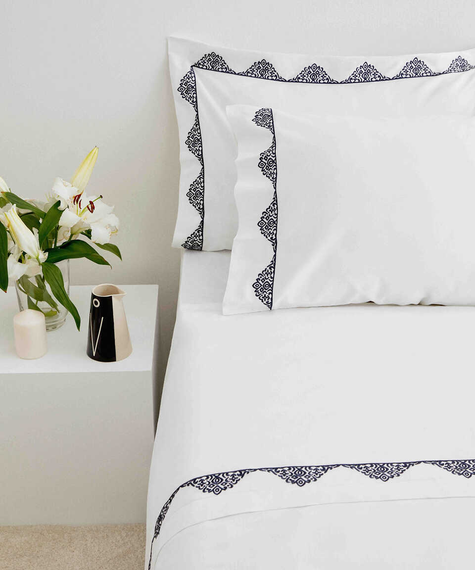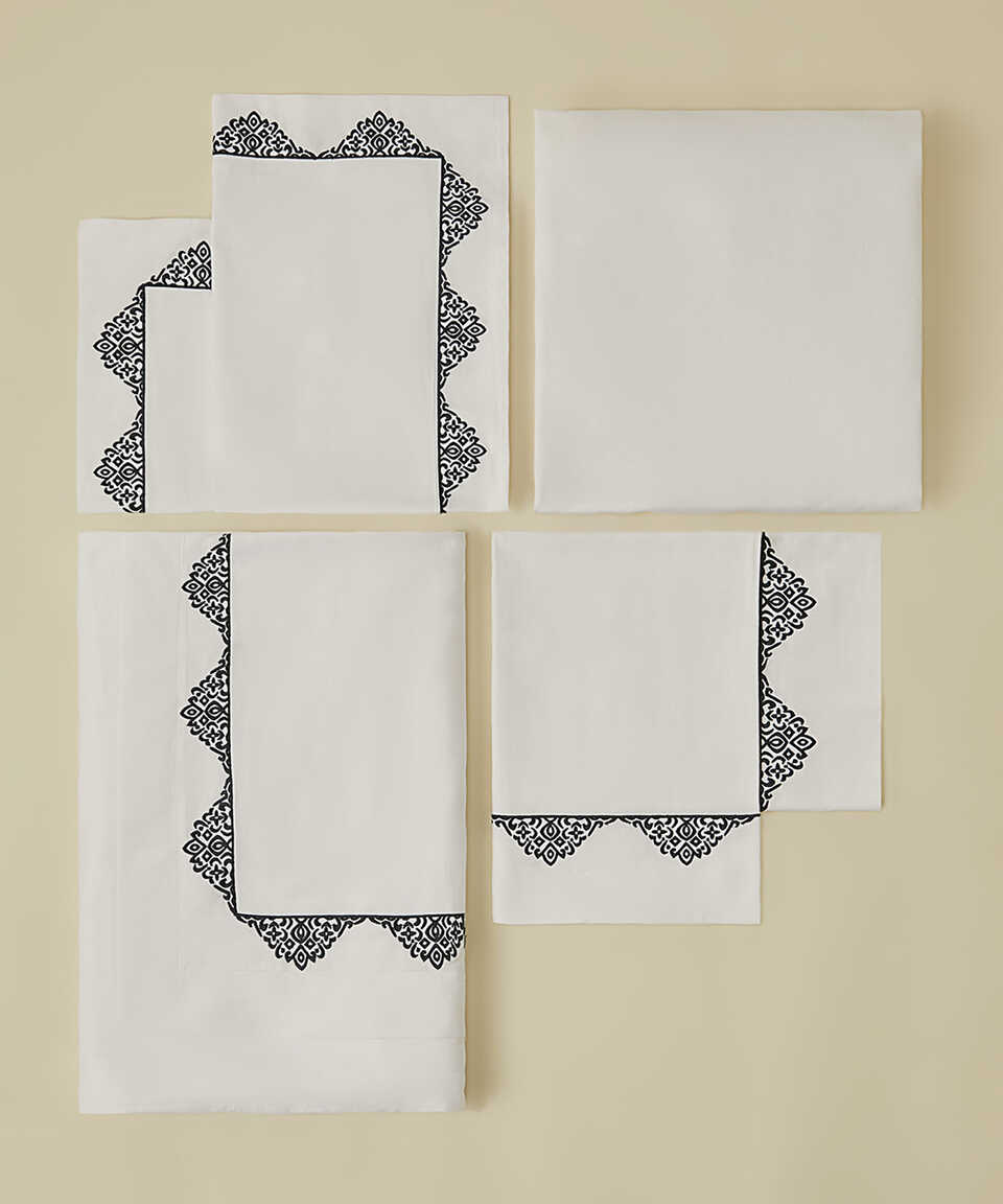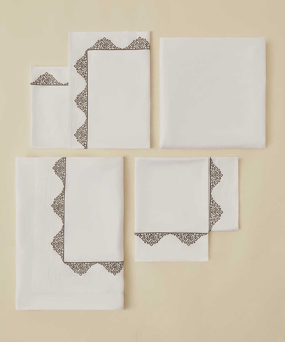 100% Cotton / Cotton , Satin / SatinEmbroidered Double Duvet Cover Set / Double Embroidered Duvet Cover Set 1 x Duvet Cover - 200 x 220 cm 1 x Bed Sheet - 275 x 275 cm 2 x Pillow Cases / Sleeping Pillow Case - 50 x 70 cm 2 x Sham Cases / Back Pillow Case - 50 x 70 cm White / Black White / Sand - White / Beige