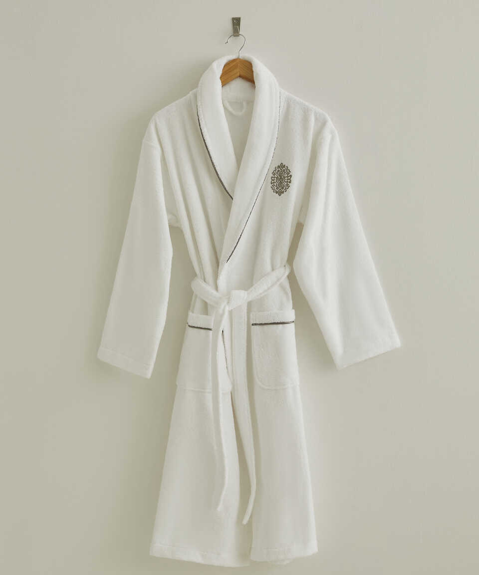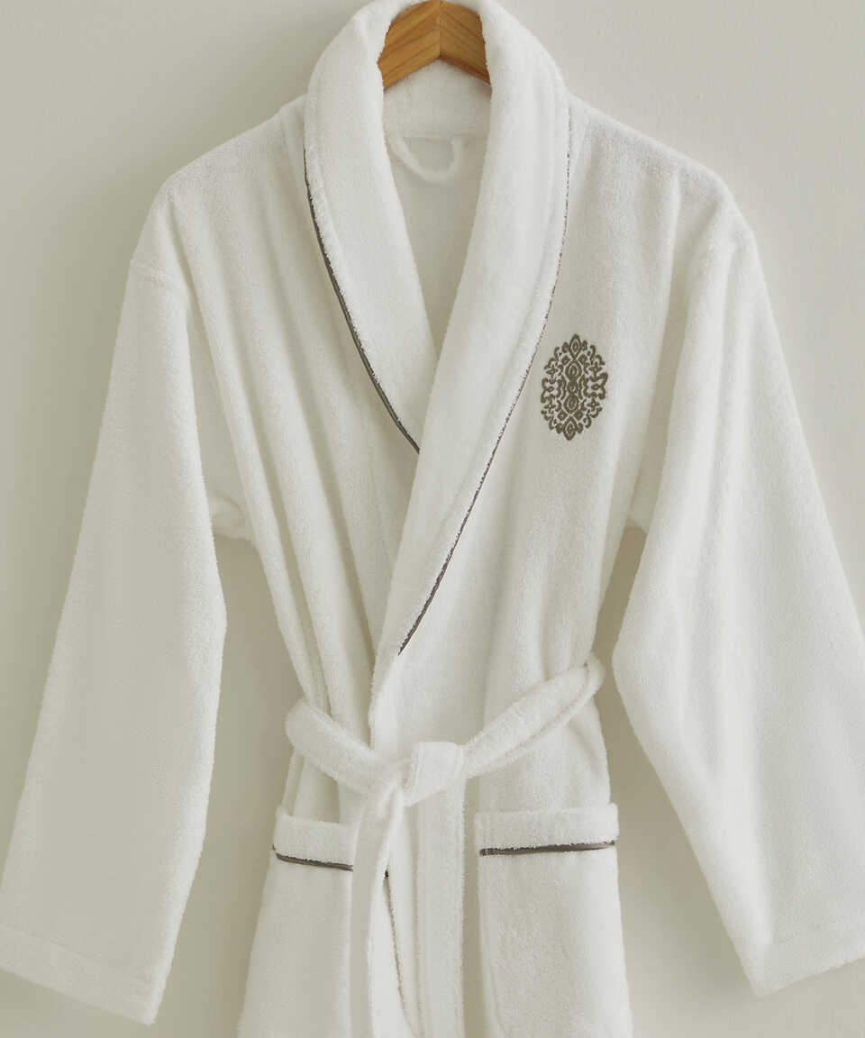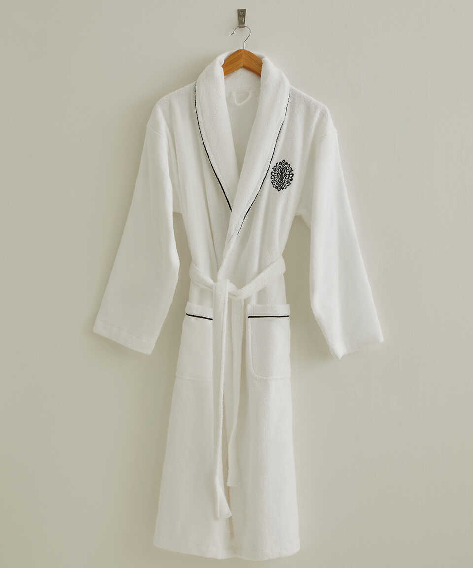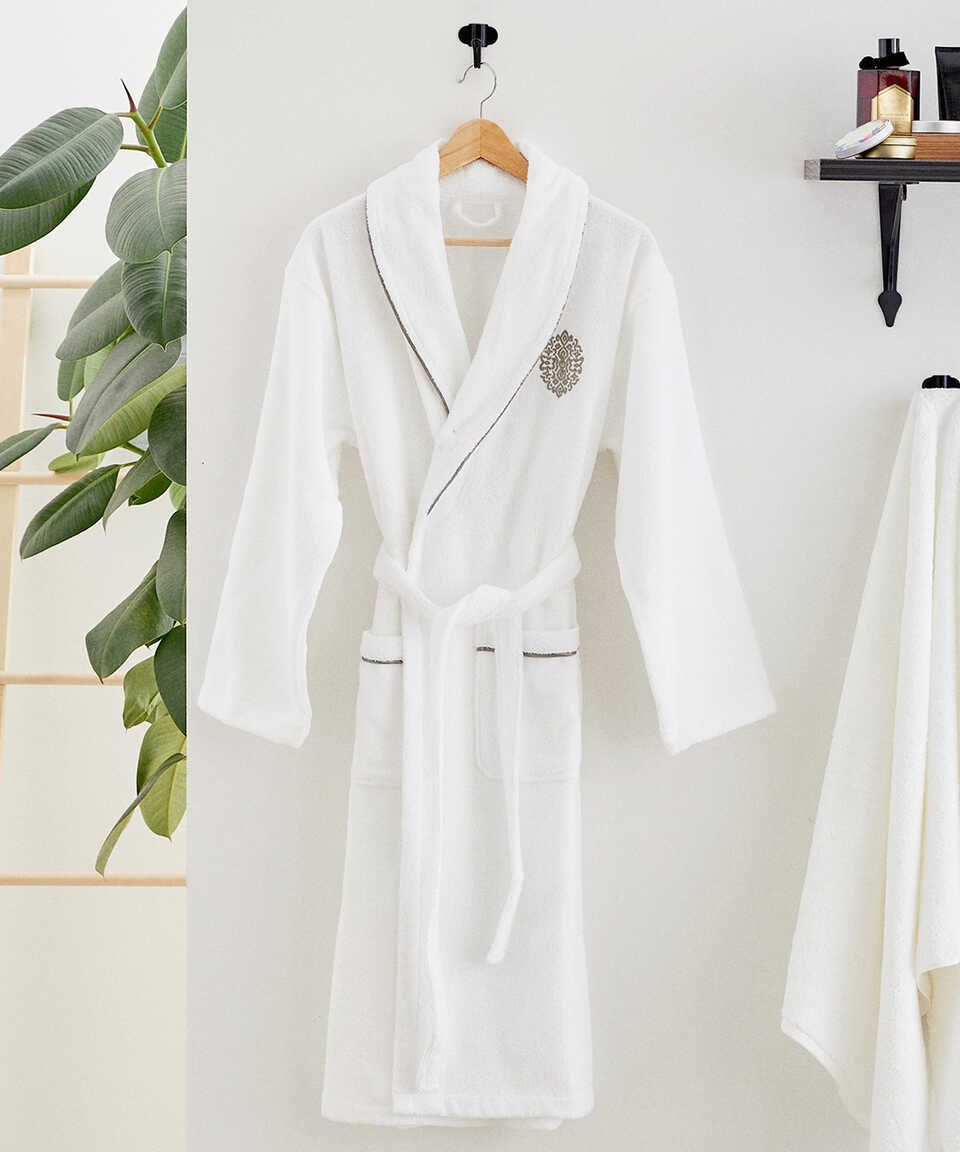 Thanks to the specially developed Micro Touch yarn quality, it does not lose its softness after washing. Due to its cotton content, water absorbency is high. With its elegant thin piping and classic motif embroidery details, it is a stylish product that will never go out of fashion. You can combine the product with the Tiara 50x100 cm towel in the towel category. You can examine our duvet cover set produced with the same embroidery detail in the bedroom category. Thanks to the specially developed Micro Touch yarn quality, it does not lose its softness after washing. Due to its cotton content, water absorbency is high. It is an elegant product that will never go out of fashion with its elegant thin piping and classic motif embroidery details. You can combine the product with the Tiara 50x100 cm towel, which is in the towel category. You can examine our duvet cover set produced with the same embroidery detail in the bedroom category. Product Content; %100 Cotton / CottonEmbroidered / Embroidered Weight / Weight; 360 g/m² Size Options / Sizes; S/M , L/XLModel; Shawl Collar Bathrobe / Shawl Collar Bathrobe Color Options / Colors; White/Black – White/BlackWhite/Sand – White/Beige
